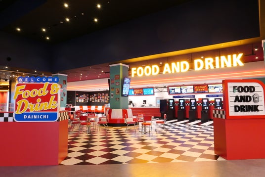 1960年代のアメリカンダイナーを思わせるポップでフォトジェニックなロビーフロアには、約60席のダイニングスペースを設けました。カラフルなサインボードやモニュメント、ジュークボックスを用いたインテリア小物などがレトロアメリカンな空間を演出。インスタ映えするおしゃれなデートスポットにおすすめです。映画を観ない方も気軽にご利用いただけます。