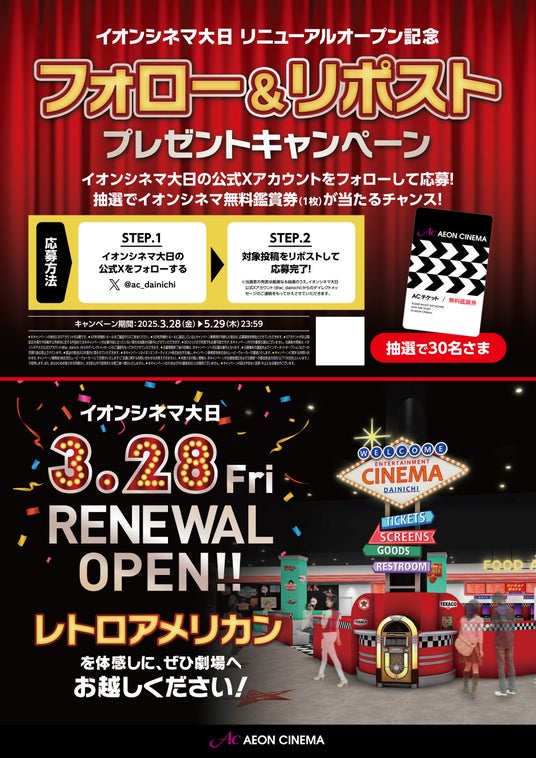 リニューアルを記念して、抽選で30名さまにイオンシネマ無料鑑賞券が当たるXフォロー&リポストキャンペーンを開催いたします。