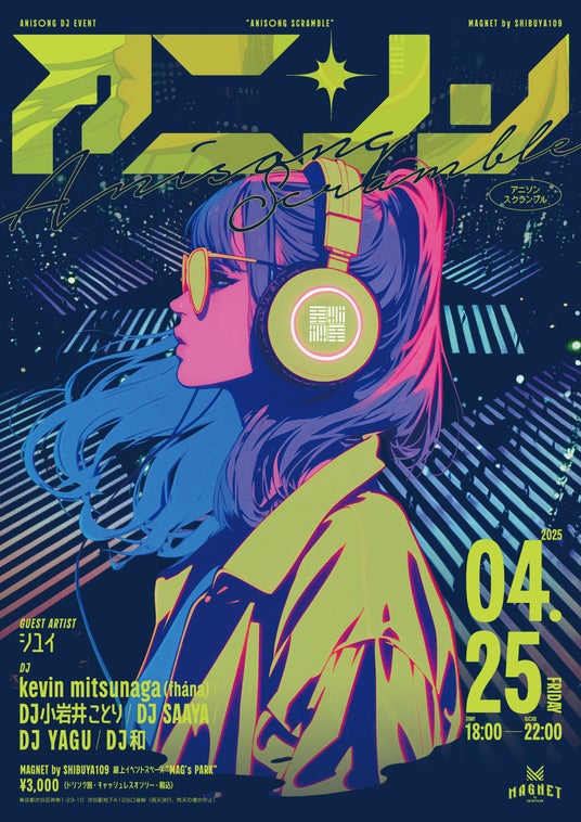 株式会社SHIBUYA109エンタテイメント(本社:東京都渋谷区、代表取締役社長:石川あゆみ)は、東京・渋谷で運営する「MAGNET by SHIBUYA109」の屋上イベントスペース「MAG’s PARK」にて、渋谷スクランブル交差点を眼下に行うアニソンDJイベント『Anisong Scramble』(アニソン スクランブル)を2025年4月25日(金)に開催いたします。