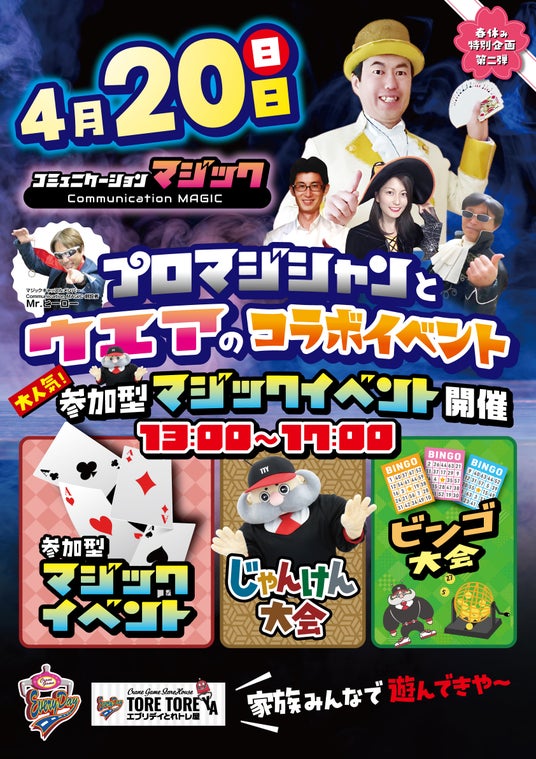 「笑顔創造」が企業理念の株式会社東洋(代表取締役:中村秀夫/本社:埼玉県北本市以下、当社)は、運営するクレーンゲームのテーマパーク【エブリデイ とってき屋】にて、コミュニケーション・マジックを4月は「エブリデイとってき屋 東京本店」「エブリデイ多摩ノ国店」「エブリデイとれトレ屋桶川店」の3店舗で開催します。