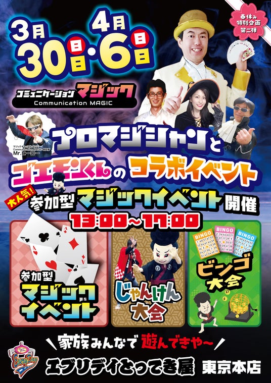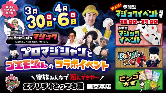 大好評につきコミュニケーション・マジックとゴエモンくんのコラボイベントを春休み中に緊急追加開催することになりました。また、エブリデイ 多摩ノ国店・エブリデイ とれトレ屋 桶川店でも4月中の開催が決定しました。
