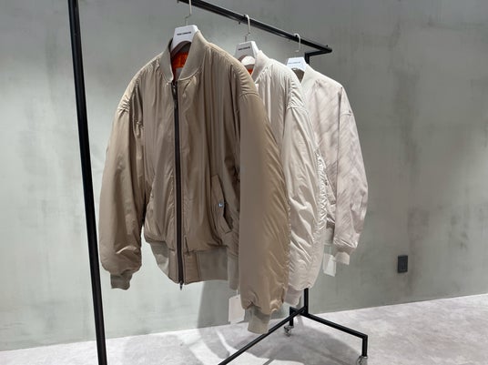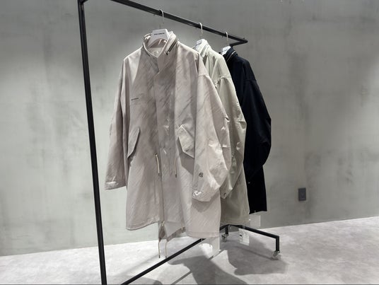 本展示会では、デザイナー丸龍文人(Fumito Ganryu)氏とのコラボレーションコレクション「MC by FUMITO GANRYU」も披露。MODE COMMUTERの機能美と、Ganryu氏の立体的なデザインが融合したアイテムの数々は、エッジの効いたモダンなシルエットが印象的で、来場者から大きな注目を集めました。