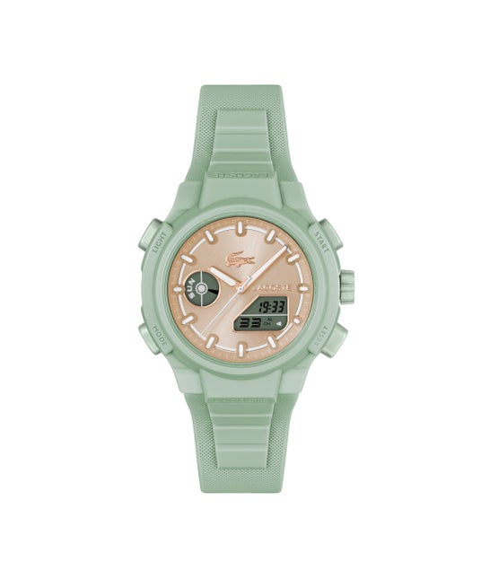 モダンなブラッシュピンク、パウダーブルー、ソフトグリーンに加え、汎用性の高いブラックやフレッシュホワイトのカラーバリエーションを展開。飛散防止加工を施したTR90製40mmケースに、アーキテクチュアルなプッシャーが付き、一体型のシリコンストラップが装備されています。ケースの6時位置、ストラップ、そしてバックルにはラコステののロゴがエンボス加工で施され、ダイアルの12時位置にはメタルでラコステの象徴であるワニがあしらわれます。また、ケース側面とシリコンストラップに、LACOSTEを象徴するプチ・ピケ(鹿子織)の装飾が型押しされます。エレガントなサテン仕上げのサンレイ文字盤は、ブラッシュピンクやパウダーブルー、ブラック等、光を反射するIP仕上げで展開。