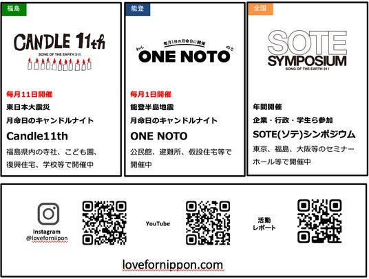 「悲しみから喜びへ」をテーマに掲げた活動を続け、2011年の東日本大震災を受けて「一般社団法人 LOVE FOR NIPPON」を発足。その後は福島をはじめ新潟中越地震や熊本地震、能登半島地震などの被災地をめぐり、支援活動を続けています。
