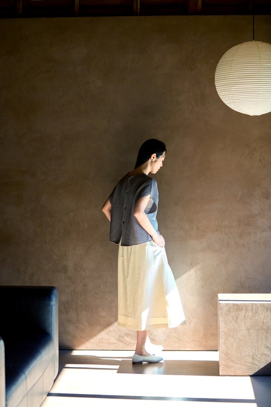 トップス:「ペーパーヤーンフレンチニットベスト / グレー」 16,500円(税込) ボトムス:「ウェザータックスカート / アイボリー」 20,900円 (税込)
