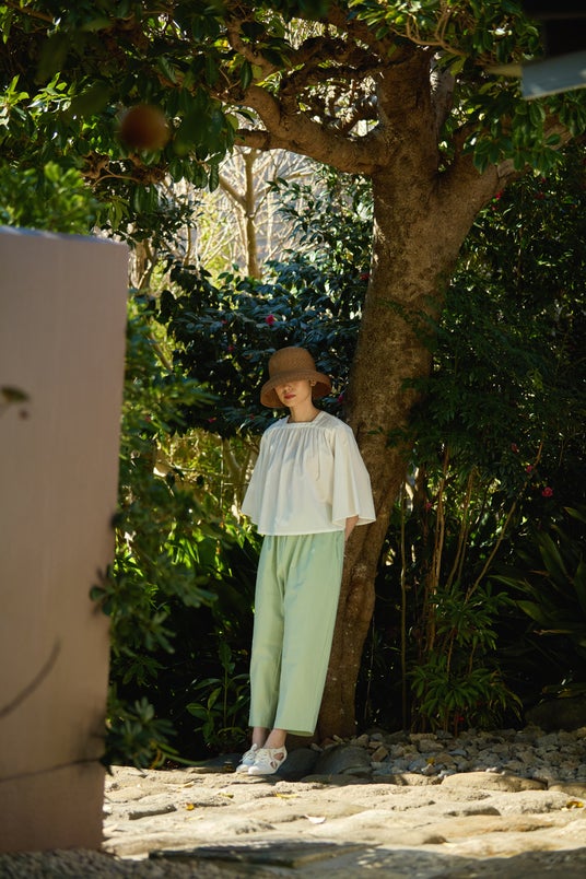 トップス:「コットンコードボイルギャザーブラウス / ホワイト(4月発売予定)」 17,600円(税込) ボトムス:「コットンリンクルギャザーパンツ / ミントグリーン(4月発売予定)」 15,400円(税込) 帽子:「カサブランカ」 15,400円(税込)