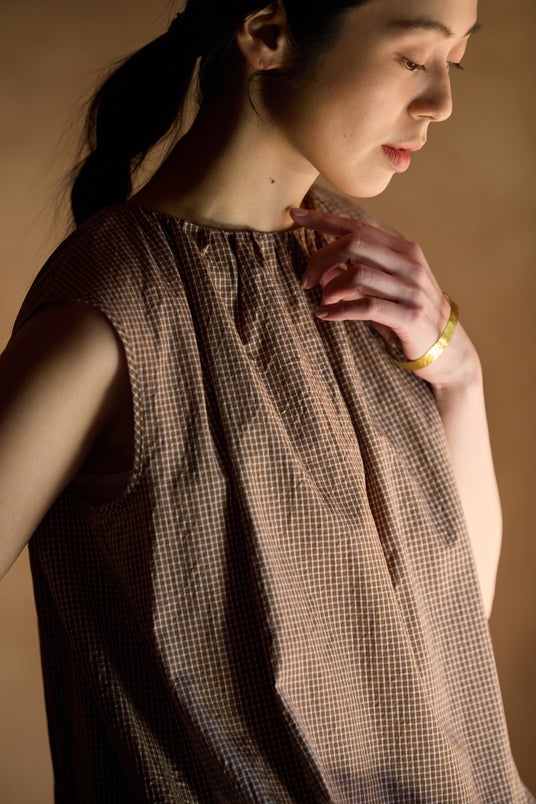 ワンピース:「コットンチェックノースリーブギャザーワンピース / ブラウン(5月発売予定)」 24,200円(税込)