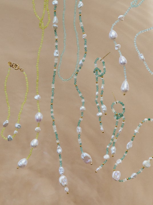 淡水パールと淡い色味の天然石をセレクトしたネックレスやブレスレットは、シャボン玉からインスピレーションをうけ、ひとさじの遊び心を添えたデザインです。Tシャツ×デニムなどシンプルなコーディネートにチェーンネックレスなどとMIXした組み合わせもおすすめ。