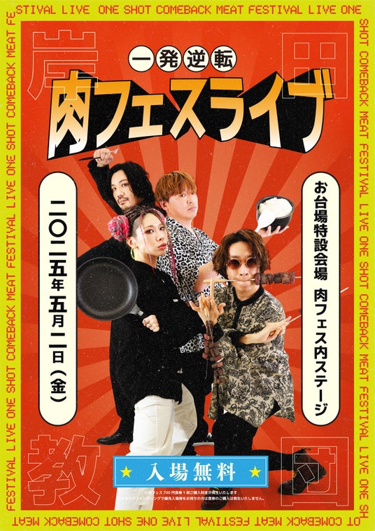 ロックバンド「岸田教団&THE明星ロケッツ」は、5月2日(金)に開催する無料野外ワンマンライブ「岸田教団ワンマンライブ 一発逆転肉フェスライブ」に向けたクラウドファンディングをクラウドファンディングプラットフォームうぶごえにて開始し、目標額100%を達成しました。