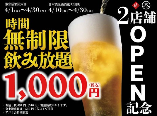 【最大11時間30種飲み放題¥1,000】2店舗OPEN記念祭!|『時間無制限飲み放題¥1,000』イベントを4月限定開催!|個室居酒屋 天日 本厚木店、日本酒原価酒蔵 町田店