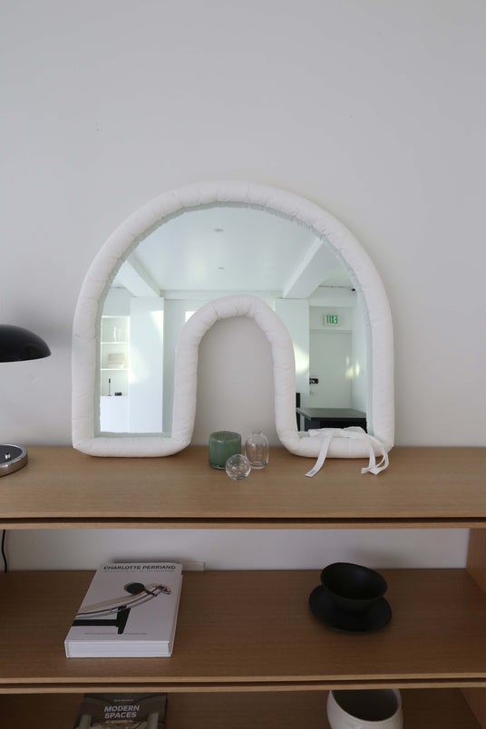 「U」型のミラーは、中央に大切なものを飾ることで空間に個性と意味をもたらすデザインです。「使う人によって機能が変化するオブジェ」であり、MIHOMIDUのシグネチャーアイテムとして愛されています。