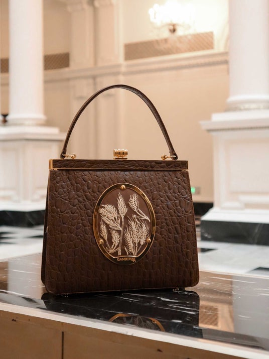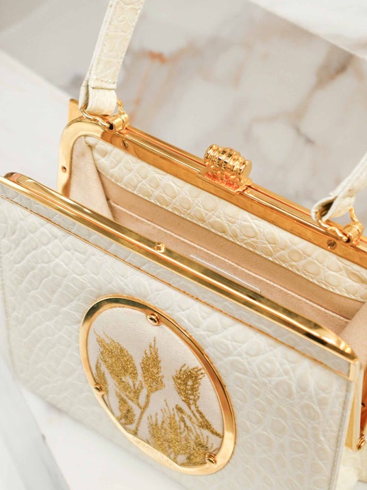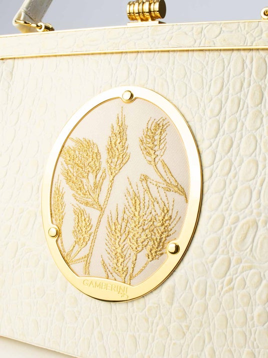 マリアバッグの焦点は、その楕円形のカメオ中心部分にあります。温かく輝く真鍮でフレームされており、イタリア北部のコモ湖畔の歴史的なテキスタイルアトリエによって繊細に刺繍されたものです。黄金色の小麦の穂を描いた繊細な模様は、豊かさ、繁栄、そして深く根付いたイタリアの遺産の象徴です。硬直した真鍮のフレームと刺繍の柔らかさとのコントラストは、過去と現在、力と繊細さの完璧なバランスを生み出します。