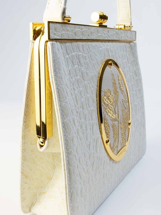しかし、マリアバッグの真髄は、その開ける瞬間にあります。それは、かつて手提げバッグを開けることが熟練し魅力的な女性らしさの行為であった時代の儀式を呼び覚ます動きです。指先は、豪華で輝く18金プレートのクラスプを滑らかに撫で、金属の滑らかな金メッキ仕上げを優しく触れながら、流れるように閉じ口を解放します。鋭く響く「カチッ」という音が、決定的でありながら調和の取れた開放を示し、洗練の世界への扉が開かれるような印象を与えます。