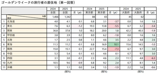 旅行者の居住地に大きな変化は見られないものの、関東が約40%、東海が約15%を占める割合は昨年とほぼ同様の傾向を示しています。