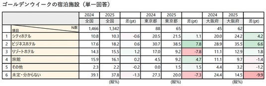 大阪府への旅行者について、ゴールデンウイークのデータを分析すると、宿泊施設ではシティホテルやビジネスホテルの需要が昨年よりも増加し、同行者の傾向としては1人旅の割合が昨年よりも伸びています。