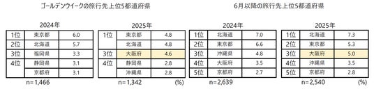 旅行の行き先となる都道府県のランキングを昨年と今年で比較すると、大阪府が「ゴールデンウイーク」「6月以降の旅行先」のいずれにおいても順位を上昇させました。ゴールデンウイークの旅行先では、昨年の6位から今年は3位に上昇し、6月以降の旅行先では昨年の4位から3位へと順位を上げました。
