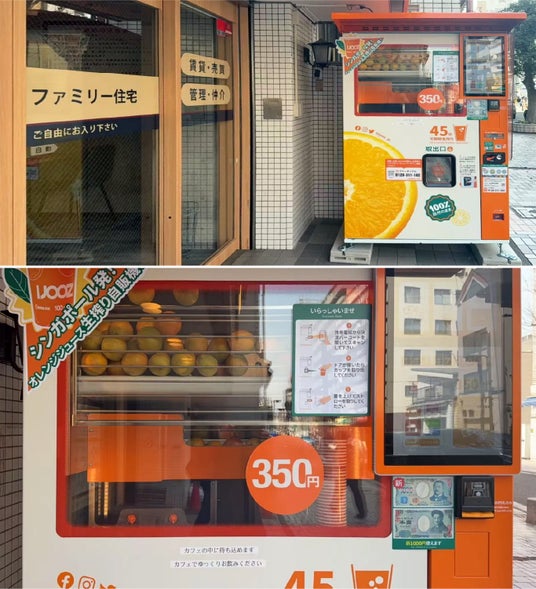 搾りたての新鮮なジュースを楽しめる、ユニークな「オレンジジュース生搾り自販機」を設置。
