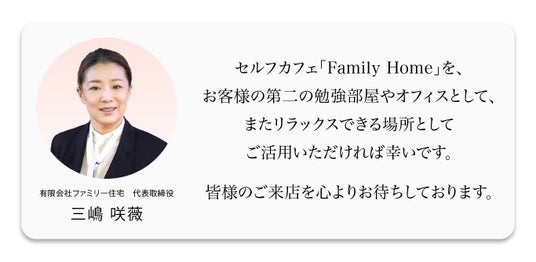 セルフカフェ「Family Home」を、お客様の第二の勉強部屋やオフィスとして、またリラックスできる場所としてご活用いただければ幸いです。皆様のご来店を心よりお待ちしております。