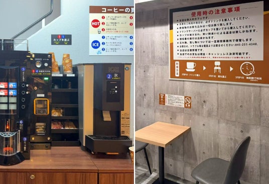 また、オレンジ生絞りジュースの自動販売機や珈琲の販売機も設置しており、お仕事や勉強の合間にほっと一息ついていただける空間を目指しました。