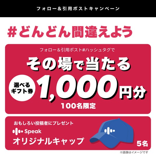 X上で、「スピーク」公式Xアカウント「@usespeak_jp」をフォローし、「#どんどん間違えよう」をつけて指定の投稿を引用してください。