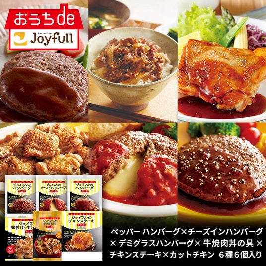 ・ジョイフルのハンバーグ(てりやきソースペッパー付)×1個 ・ジョイフルのチーズインハンバーグ(トマトソース付)×1個 ・ジョイフルのハンバーグ(デミグラスソース付)×1個 ・ジョイフルの味付け〈生〉鶏もも肉×1袋 ・ジョイフルのうすぎり牛焼肉×1袋 ・ジョイフルのチキンステーキ×1袋