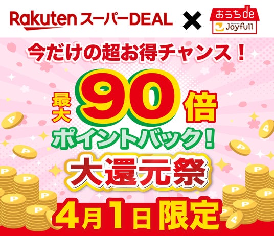 ファミリーレストラン ジョイフル (本社:大分県大分市 代表取締役社長:穴見くるみ) では、店舗でお出ししている商品を家庭用にアレンジした冷凍商品ブランドの「おうちdeジョイフル」を販売しています。この度、2025年4月1日(火)の1日限定で、「楽天スーパーDEAL」にて、最大90倍のポイントを付与いたします大還元祭に出店いたします。