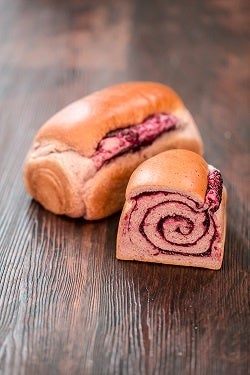 生地にはオリジナルのブルーベリーソースをたっぷり練り込み、一斤に130グラム前後の甘酸っぱいジャムが、渦巻き状に巻き込まれている逸品。