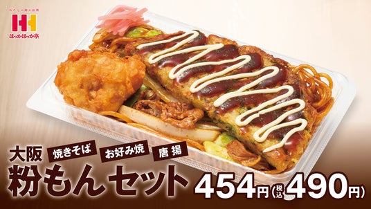 また、4月13日(日)からは、焼きそば・お好み焼・唐揚をセットした「大阪粉もんセット」を発売いたします。このお好み焼は、大阪・関西万博「大阪ヘルスケアパビリオン」への出店ブースで販売される、ほっかほっか亭のオリジナルメニュー。ヘルシー志向がさらに高まると予想されるミライをイメージし、満足感はそのままに、軽い食感にこだわり、植物性たんぱく質を中心に、野菜を50%以上配合しました。枝豆の食感も楽しめるおいしいお好み焼です。野菜たっぷりのソース焼きそばに、ほっかほっか亭の大人気唐揚と一緒にお召し上がりください。