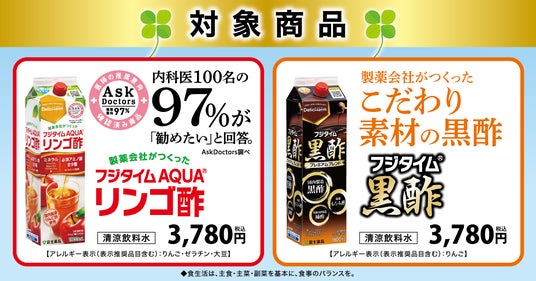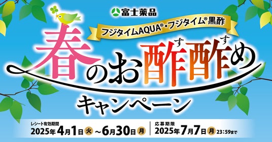 医薬品の研究開発から製造・販売までを行う複合型医薬品企業の株式会社富士薬品(本社:埼玉県さいたま市 代表取締役社長:高柳 昌幸、以下「富士薬品」)は、「セイムス」をはじめとする富士薬品グループのドラッグストアおよび富士薬品公式通販・配置薬をご利用のお客様に向けて、2025年4月1日(火)から6月30日(月)までの期間中に「フジタイムAQUA(R)」または「フジタイム(R)黒酢」をご購入のうえご応募いただくと、合計200名様に賞品が当たる「春のお酢酢めキャンペーン」を開催します。