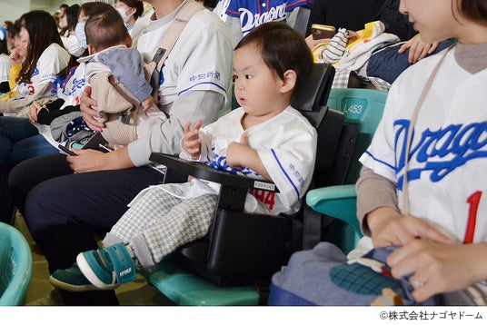 スタジアム等の椅子にも設置可能。小さなお子様連れの家族も一緒にスポーツ観戦を楽しめます。※写真は、IKOUポータブルチェアをご導入・お客様へのレンタルサービスをされているバンテリンドームナゴヤ(株式会社ナゴヤドーム)様での様子。