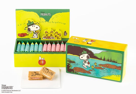 2.アウトドアをイメージしたカラーのボックスは、蓋を開けるとスヌーピーがリーダーをつとめるビーグル・スカウトの仲間たちが飛び出してくるポップアップ付き!