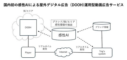 『Trig’s』とは、インターネット上のコンテンツの閲覧データを基にターゲットの感性価値をAIで分析し、広告商材の感性価値とマッチングさせるPMP※広告サービスです。本サービスをDOOH領域にも導入し視認者の感性データを活用することで、デジタル(PMP広告)とリアル(DOOH)を組み合わせた広告配信を実現します。