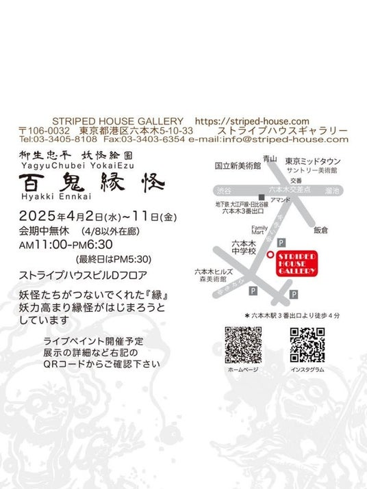 香川県・小豆島の「迷路のまち」(土庄本町)にある妖怪美術館(小豆島ヘルシーランド株式会社)の館長をつとめる妖怪画家・柳生忠平は、六本木(東京)のストライプハウス・ギャラリーにて個展「柳生忠平妖怪絵圖 百鬼縁怪」を開催します。この個展では「妖怪たちがつないでくれたご縁」をテーマに創作した新作を多数展示。会期中(4月8日を除く)は本人が終日在廊する予定です。