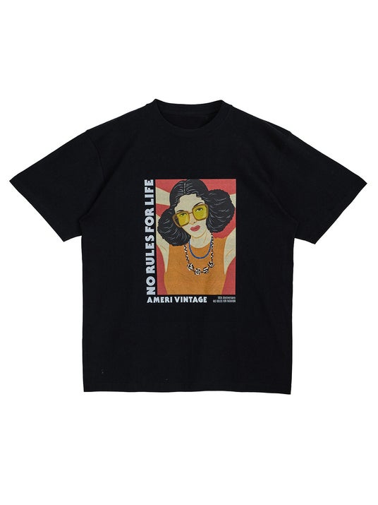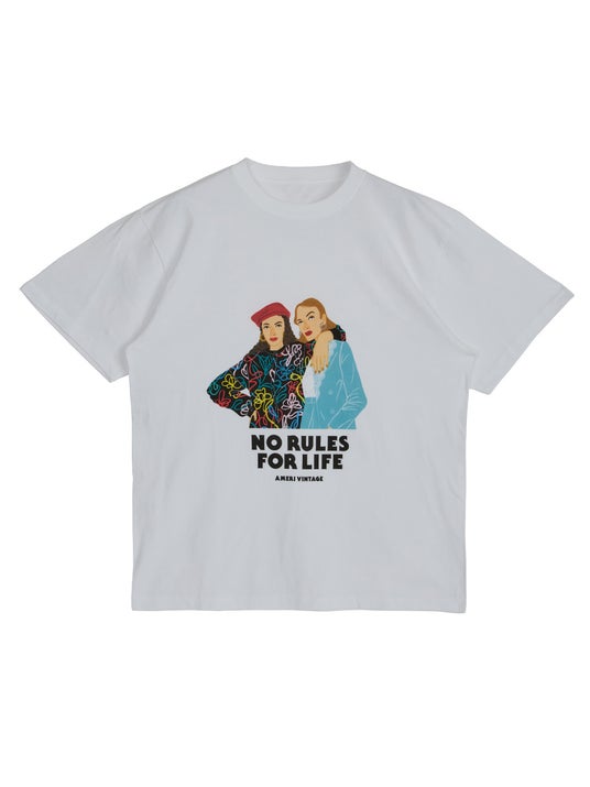 Ameriの洋服を纏った二人の女性と、クールな女性を大胆に描いたコンセプチュアルなアイテムになりました。Tシャツには、フェスイベントのスローガン「NO RULES FOR LIFE」をあしらい、ユニセックスでご着用いただけるサイズでご用意。