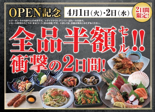 リニューアルオープンを記念して、2日間限定で店内ご飲食にかぎり“全品半額のオープンセール”を実施します。