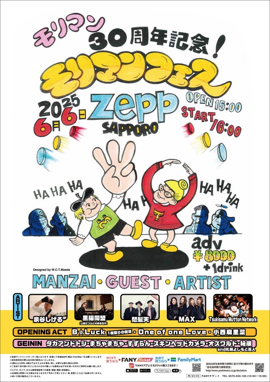 モリマンと親交の深いアーティストに「30周年を祝ってほしい!」と、自ら出演交渉し、豪華アーティストの方々が大集合します。また、同じく30周年を迎えたタカアンドトシや北海道出身のオズワルドなども出演、札幌よしもと所属芸人も全員で会場を盛り上げます。キービジュアルは、W.C.T Maeda氏にお願いし、モリマンらしいビジュアルも完成しました。