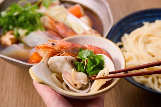 天然かつおの風味豊かな自慢の黄金だしと、新鮮な魚介類、圧倒的な強さのコシと、つるつるとしたのど越しのうどんが楽しめる「うどんすき」。魚介と野菜をこだわりの出汁でお召し上がりいただけるすし半の看板商品です。