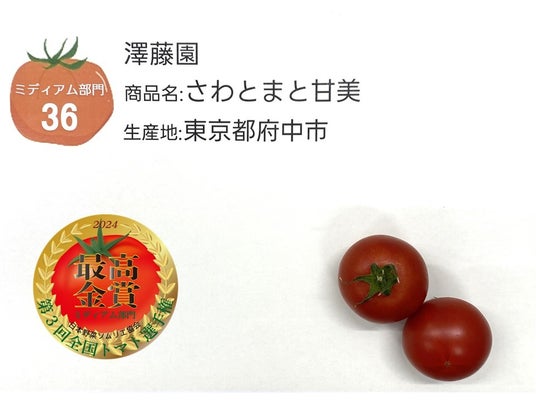 前回、第3回全国トマト選手権では全国各地からミディアムトマト46品、ラージトマト35品のエントリーがありました。ミディアム部門では東京都の澤藤園の「さわとまと甘美」が、ラージ部門では宮城県の株式会社まやまのさとうファームの「まやまのニコニコフルーツトマト」がそれぞれ最高金賞を受賞しました。