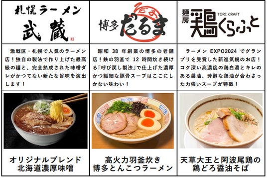 今年のラーメン祭では、北は北海道・札幌の名店「札幌ラーメン 武蔵 本店」から、南は九州・福岡の老舗「博多だるま 総本店」まで、全国の名店が集結します!