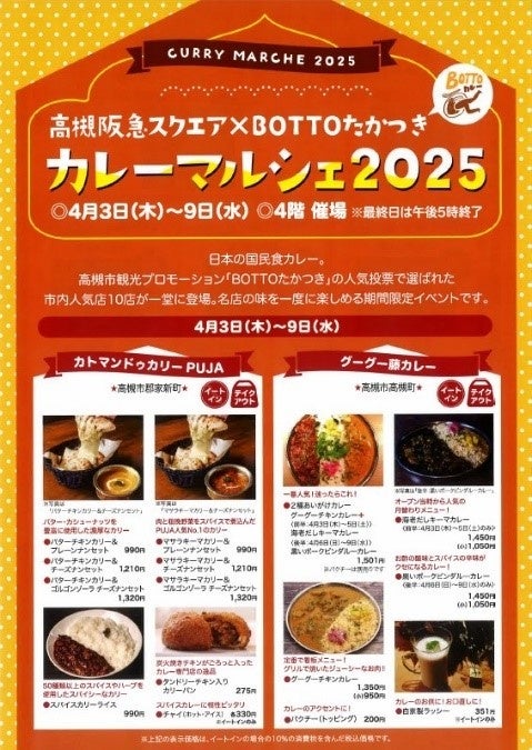 本市は、駅付近のカレー店舗数が大阪府内トップクラスであることから、「BOTTOカレー」と題し、市内カレー店舗の人気投票などを実施しています。今回は、高槻阪急スクエアと高槻の魅力に没頭してもらう「BOTTOたかつき」の取り組みとのコラボイベントとして、令和6年度に行ったSNSなどでの人気投票で選ばれた市内人気カレー店10店舗が高槻阪急スクエアの4階に集合。人気のバターチキンカレー、摂津峡近くの畑で育てた自家製の野菜を使用した野菜が主役のカレー、みそソムリエによる新感覚キーマカレー、牛肉たっぷりのカレーパンなど、各日、15種類以上の中からお好みの商品をお楽しみいただけます。なお、数に限りのある商品もあります。名店が集まる期間限定イベントにぜひお越しください。