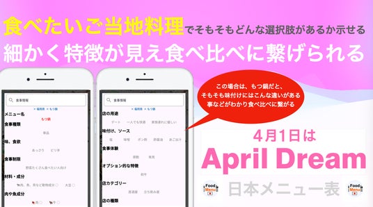 「食事比較」の店検索アプリ「日本メニュー表」を提供するFoodmenu.world株式会社は、4月1日を夢を発信する日にしようとするApril Dreamに賛同しています。このプレスリリースは「Foodmenu.world株式会社」の夢です。