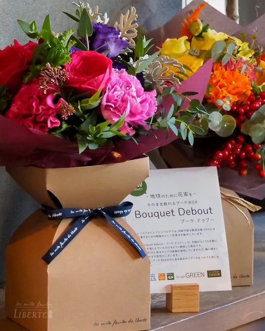 Going GREEN 地球のために花束を「Bouquet Debout - ブーケ ドゥブー」は、環境に配慮した資材を使用し、花瓶がなくても手軽にブーケを楽しめるように開発された商品です。