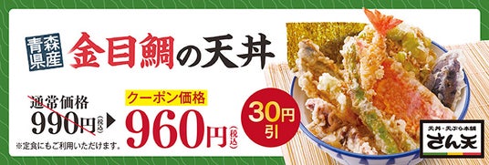 「天丼・天ぷら本舗 さん天」公式アプリでは、販売期間中に使える「【青森県産】金目鯛フェア 30円引きクーポン」を配信いたします。会員の方限定でご利用いただけるクーポンですので、この機会にぜひ「天丼・天ぷら本舗 さん天」公式アプリをダウンロード&会員登録ください。