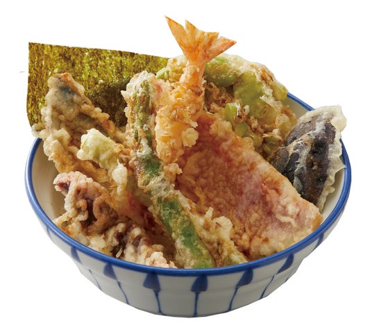 旨味のある「金目鯛」と「グリーンアスパラ天」「兵庫県産ホタルイカ天」など旬の味覚が盛りだくさんの天丼です。