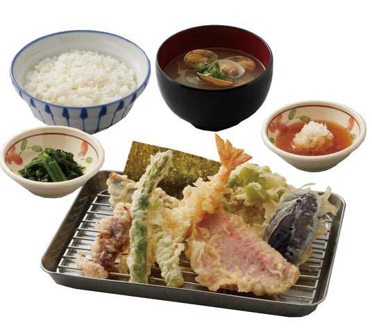 「金目鯛」と「グリーンアスパラ天」「兵庫県産ホタルイカ天」など旬の味覚が盛りだくさんの天ぷらに、ほうれん草のお浸しや、お味噌汁が付いたバランスのよい一品です。