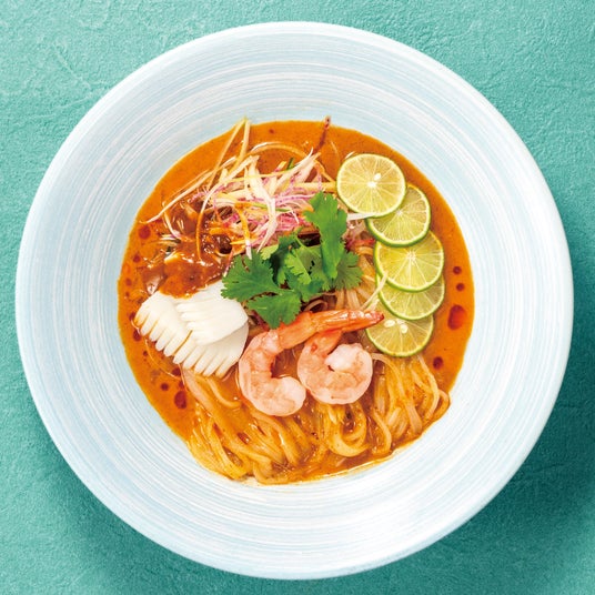 濃厚な海老の旨みが決め手の冷製トムヤムスープが、つるもち食感の冷麺にほどよく絡み、蒸し暑くなる時期にもさっぱりすっきりお召し上がりいただけます。