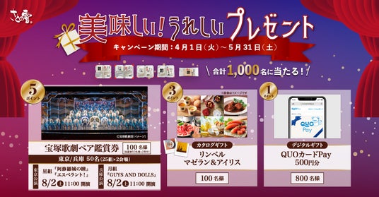 四国化工機株式会社のグループ会社である、さとの雪食品株式会社(徳島県鳴門市大津町、代表取締役社長:植田滋)は、対象商品を購入したレシートでポイントをためて応募すると、宝塚歌劇ペア鑑賞チケットやリンベルのカタログギフト、QUOカードPayが抽選で当たる、さとの雪「美味しい!うれしいプレゼントキャンペーン」を2025年4月1日より開催いたします。