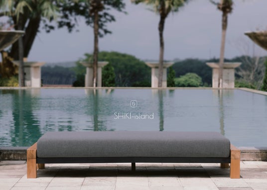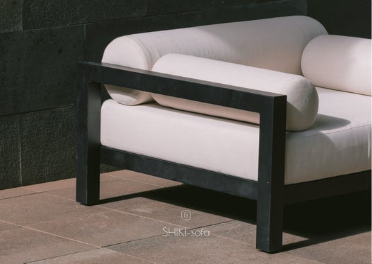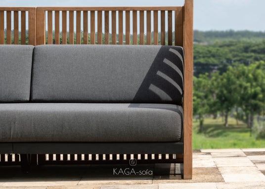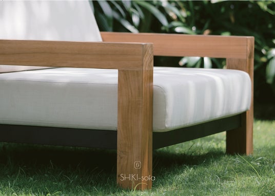 1. SHIKI-sofa - チークフレームアーム部分に高品質なチーク材を使用。天然木ならではの温かみのある質感と、美しい木目が楽しめるモデル。ベースとバックレストにはアルミを使用。
