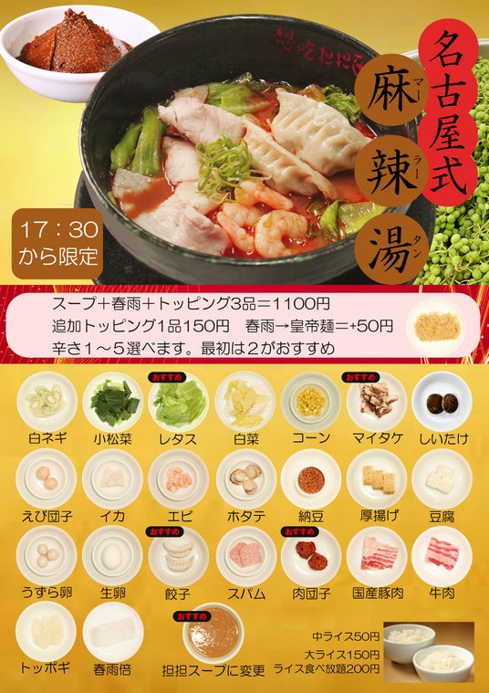 名古屋式麻辣湯春雨&3点トッピング付 1,100円(税込) トッピング1種類追加につき150円(税込)
