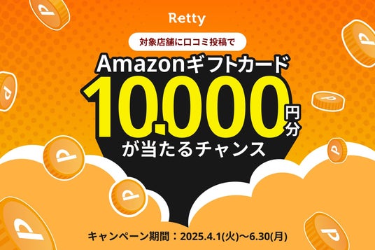 実名口コミのグルメ情報・予約サイト「Retty(レッティ)」を運営するRetty株式会社(本社:東京都港区、代表取締役 執行役員CEO:武田 和也)は、「Retty 2025口コミ投稿キャンペーン」を2025年4月1日(火)から6月30日(月)まで開催します。期間中、Rettyに対象店舗の口コミを投稿した方の中から、抽選で合計45名様に最大10,000円分のAmazonギフトカードを進呈します。